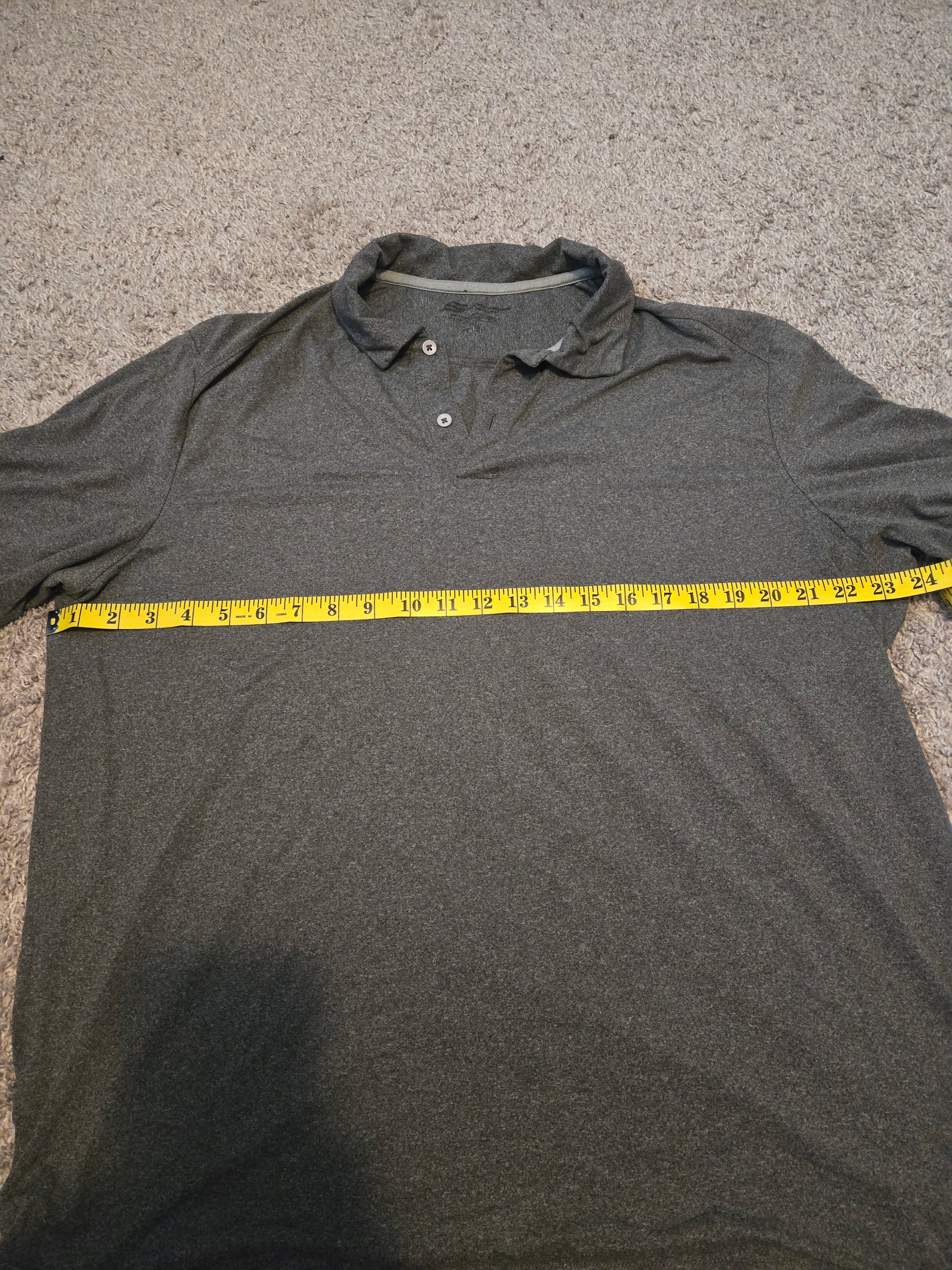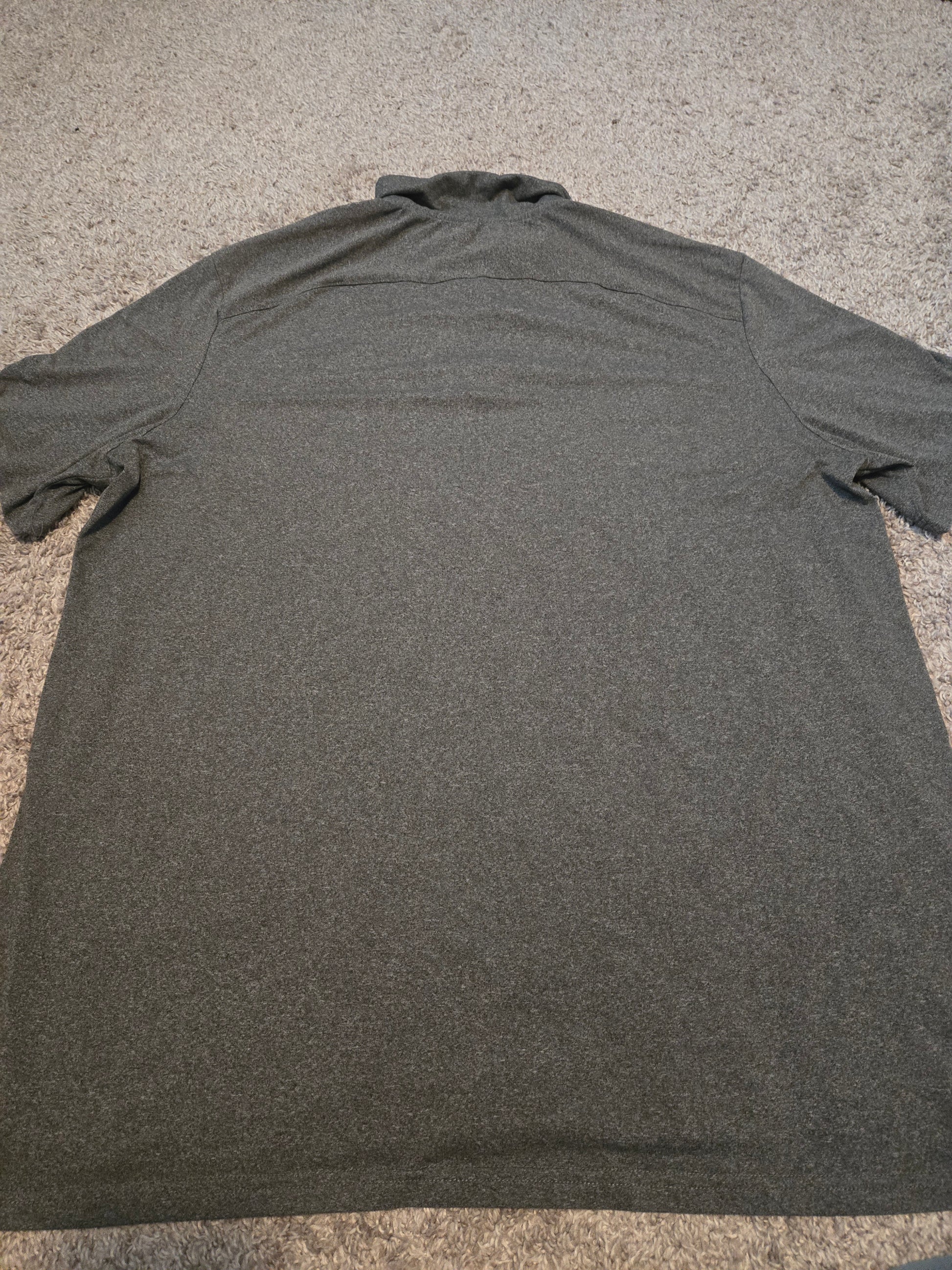 "Upgrade your wardrobe with our Gray Sketchers Polo Shirt. This gently used shirt offers a comfortable fit and easy care with its machine washable fabric. The classic polo style and short sleeves make it a versatile piece for any occasion. Available in size XL for men."
