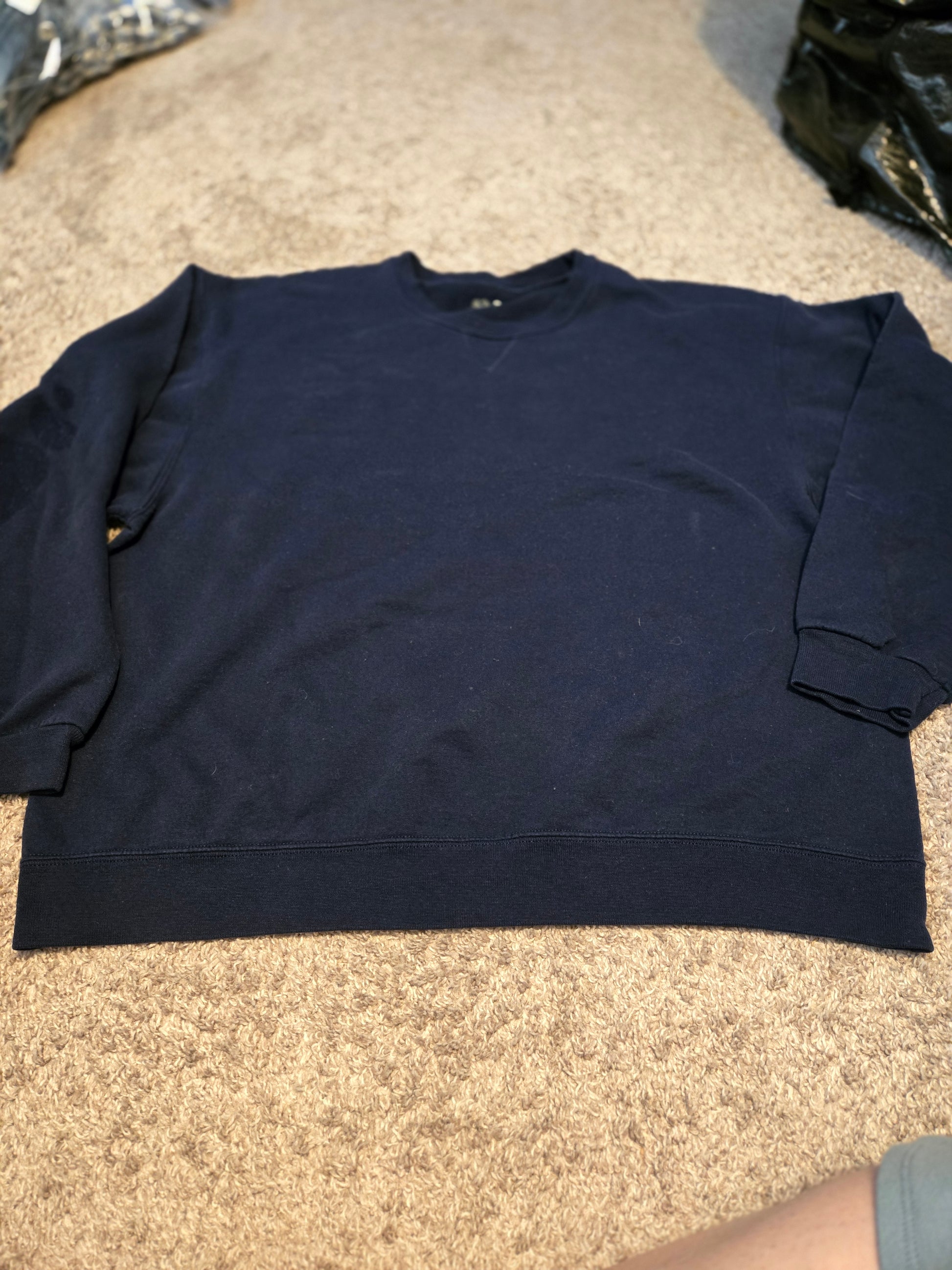 Stay warm in style with this gently used navy blue/black Fruit of the Loom long sleeve pullover sweatshirt. Perfect for winter and fitness, this men's XL sweatshirt is machine washable and effortlessly stylish. Grab it before it's gone! (Winter never saw this coming!)