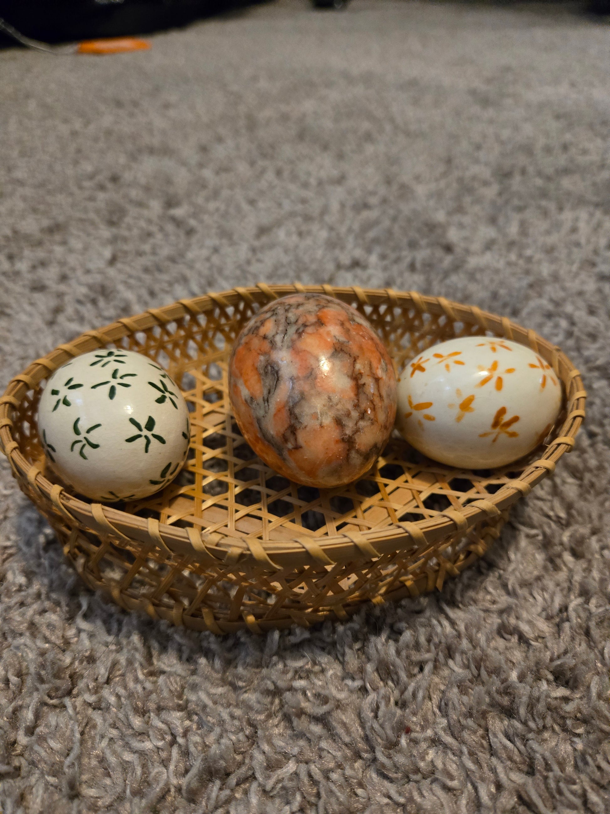 Add a touch of charm to any room with this wicker basket filled with glass and quartz eggs. The pink color and animal-shaped eggs make it a perfect decorative piece for all occasions. Measuring 7 inches in length, 4 inches in width, and 3 inches in height, this small basket is suitable for display on a window or wall.