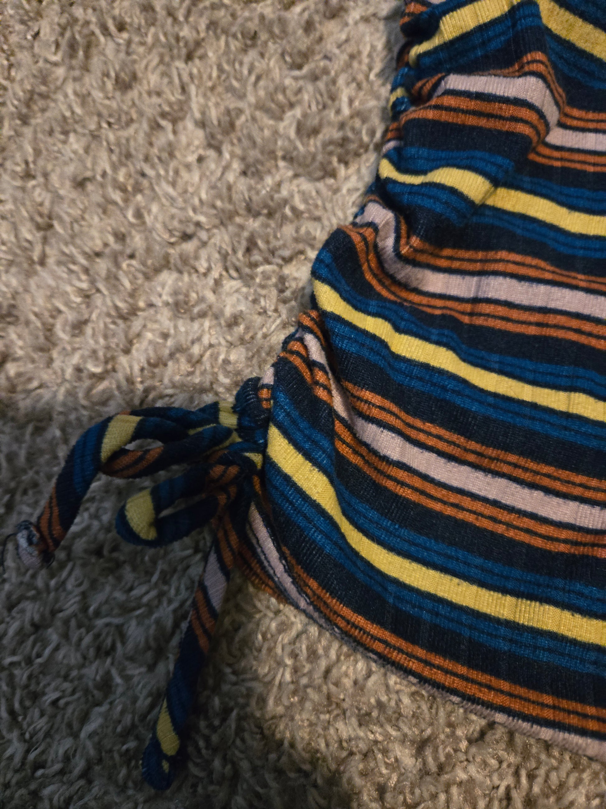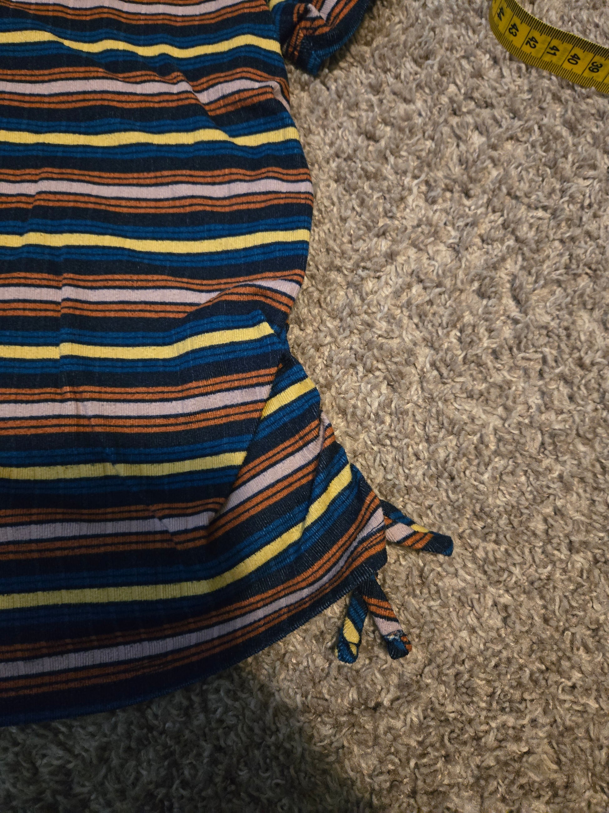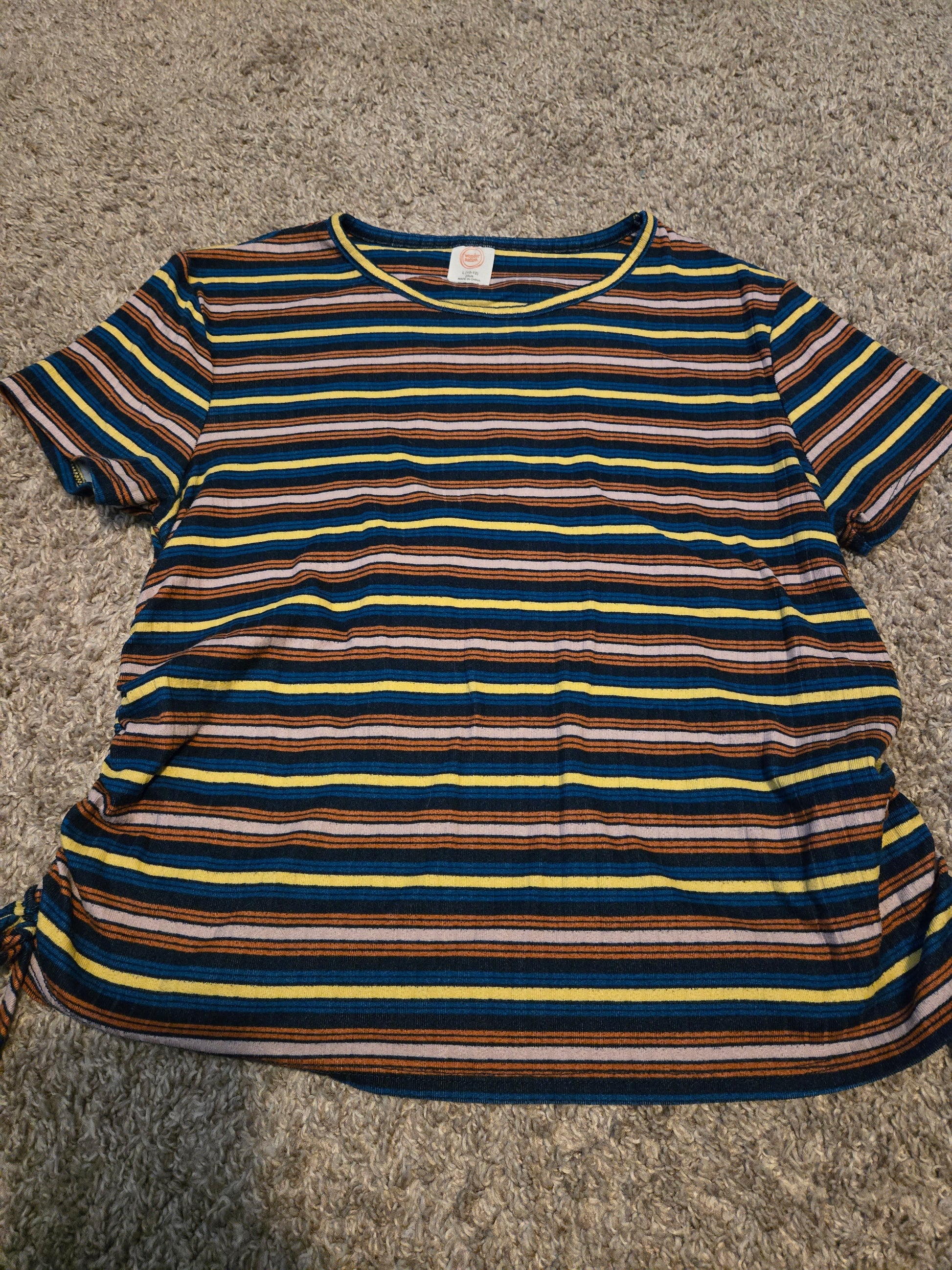 Wonder Nation Blue, Yellow, Red Striped T-Shirt Youth by Wonder Nation delivers a vibrant and stylish addition to any young girl's wardrobe. This colorful t-shirt is perfect for brightening up outfits during summer, fall, or spring.